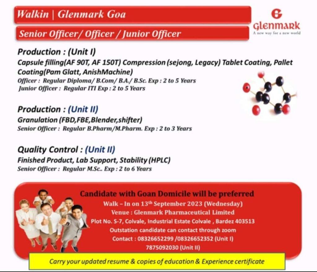 Glenmark Walk in Interview for Senior Officer/ Officer/ Junior Officer – Production, Quality Control department on 13th September 2023
