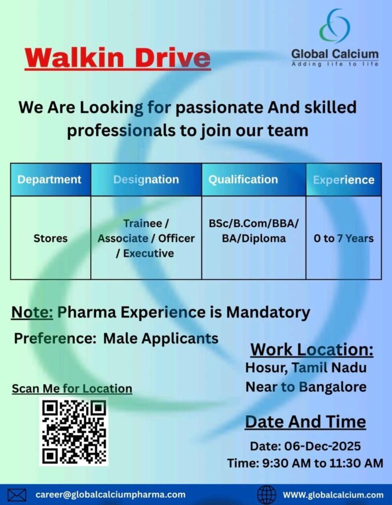 Global Calcium, a reputed name in the pharmaceutical and nutraceutical industry, has announced a Walk-In Drive for multiple positions in the Stores Department. The company is inviting passionate and skilled professionals to join their team at the Hosur facility, located close to Bangalore.