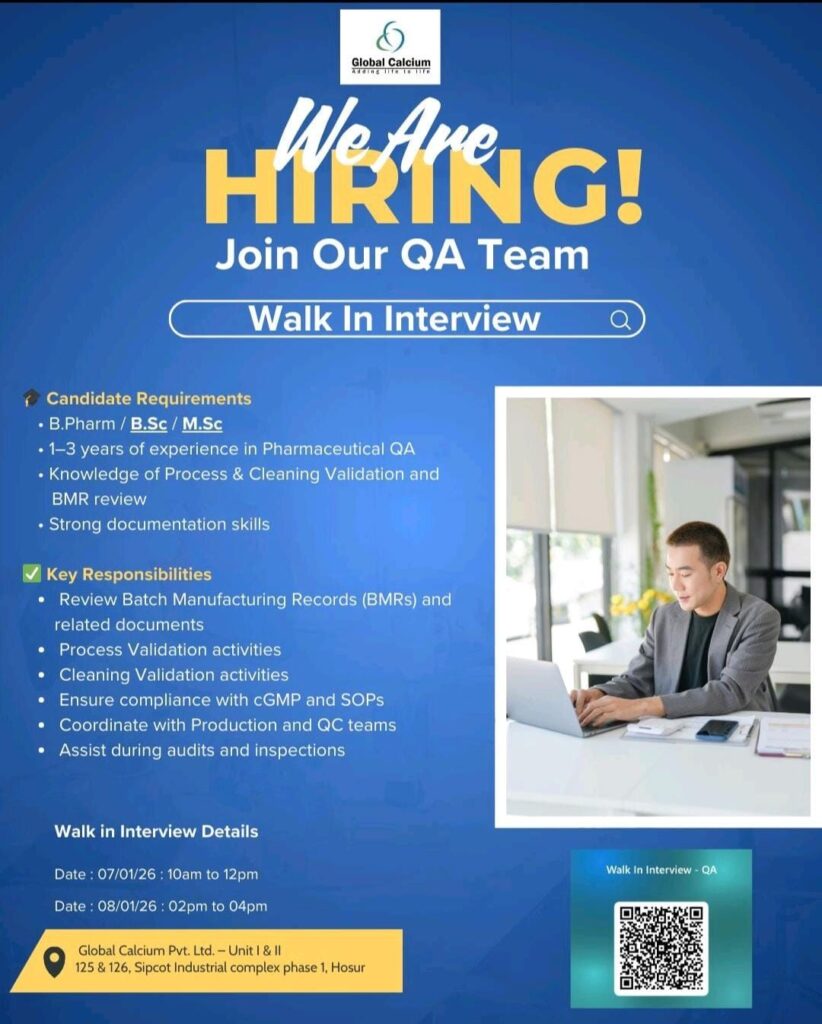 Global Calcium Pvt. Ltd. is hosting a walk-in interview drive to expand its Quality Assurance (QA) team at its Hosur location. This recruitment initiative is aimed at pharmaceutical professionals looking to advance their careers in a dynamic regulatory environment.