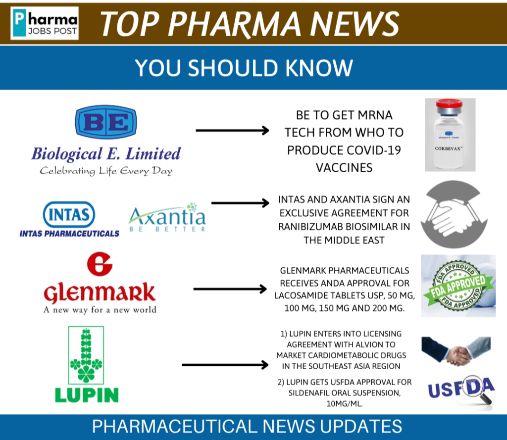Top Pharma News Updates- Glenmark, Lupin, Intas Pharma, Amneal Pharma & Biological E. Limited (BE)