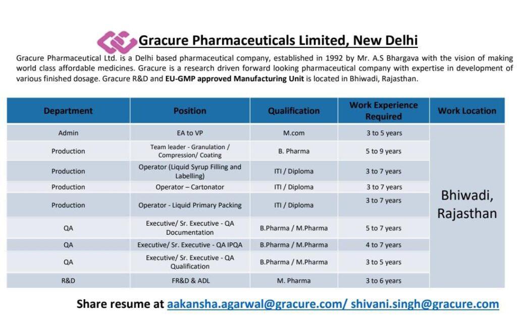 Gracure Pharma hiring for QA, Production, R&D, Admin department
