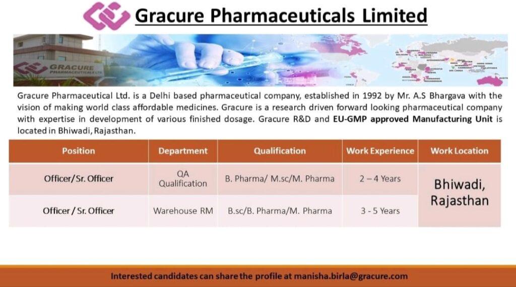 Gracure Pharmaceutical hiring for QA Qualification & Warehouse department