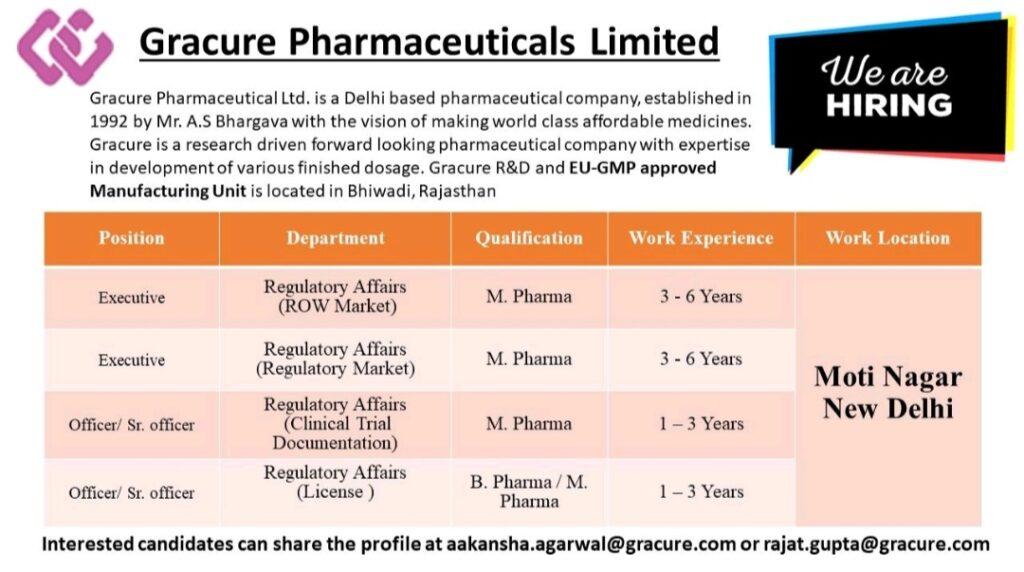 Gracure Pharmaceutical multiple job vacancy in Regulatory Affairs department