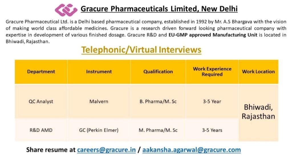 Gracure Pharmaceutical- Telephonic/ Virtual Interviews for QC Analyst, R&D AMD – Apply Now
