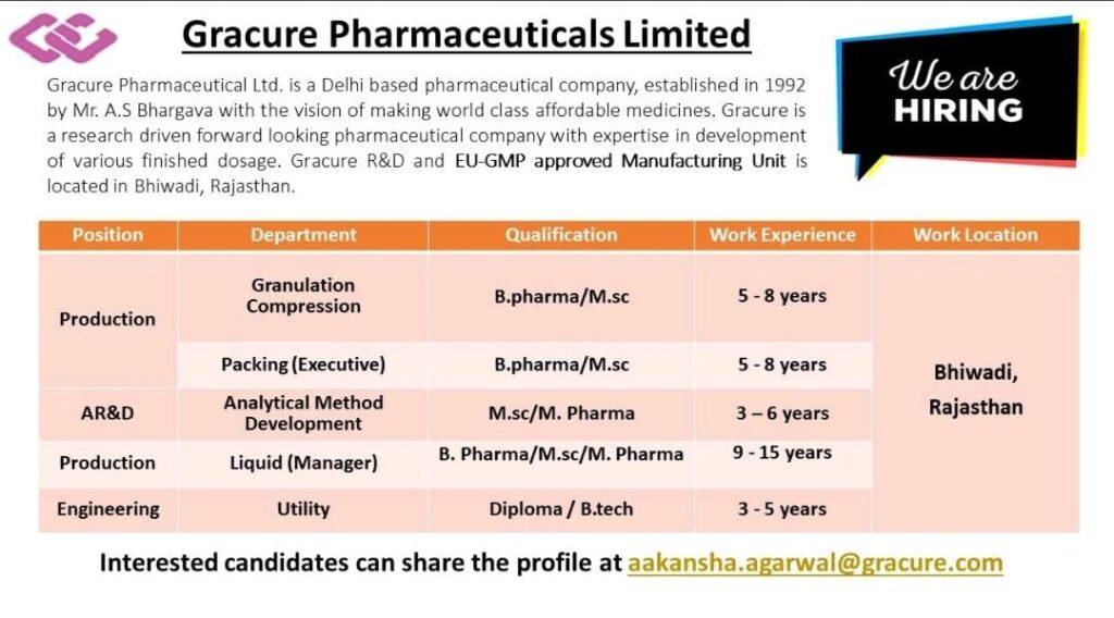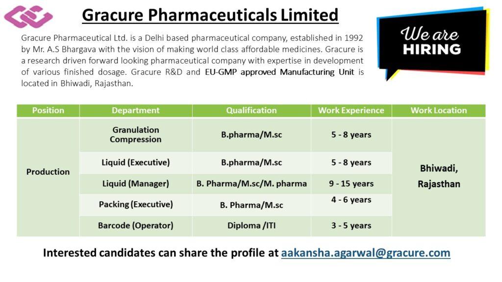 Gracure Pharmaceuticals job vacancy for Production, AR&D, Engineering department