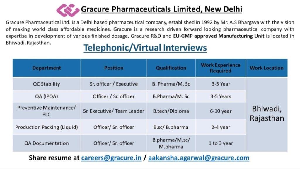 Gracure Pharmaceuticals- Telephonic/ Virtual Interviews for QC Stability, QA (IPQA), Preventive Maintenance/ PLC, Production Packing (Liquid), QA Documentation- Apply Now