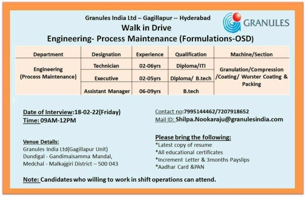 Granules India Limited- Gagillapur- Hyderabad Walk-In Interviews for Engineering – Process Maintenance on 18th Feb’ 2022