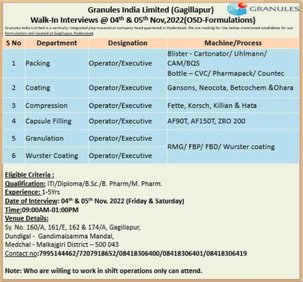 Granules India Limited Walk-In Interviews for Packing, Coating, Compression, Capsule Filling, Granulation & Wurster Coating on 04th & 05th Nov,2022 (OSD-Formulations)