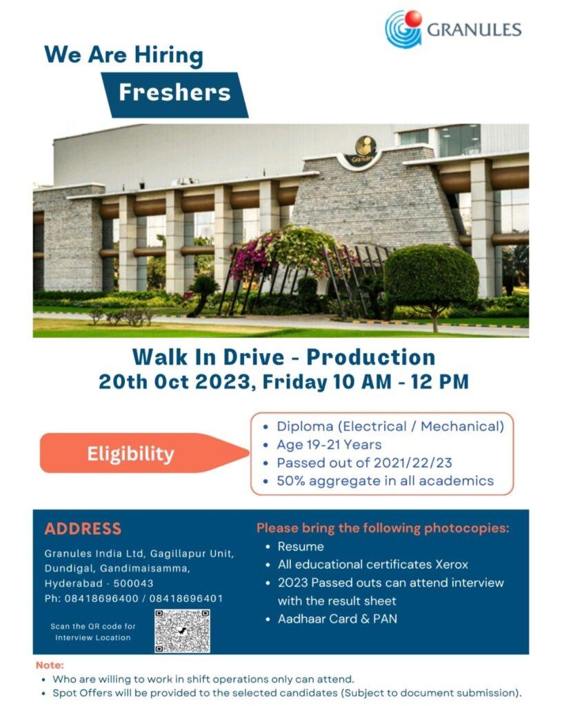 Diploma Fresher’s Walk-in Drive for Production at Granules India Limited (Formulation – OSD) on 20th Oct, Friday!