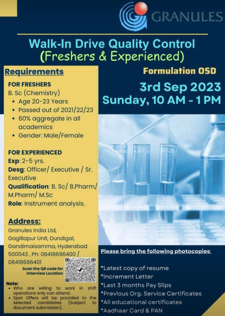 Granules India Ltd- Walk In Drive on 3rd Sep 2023(Sunday) for Quality Control department