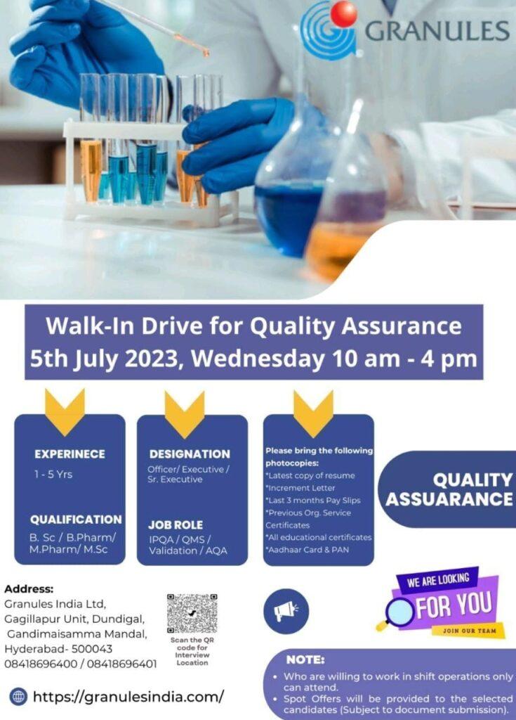 Granules India Ltd Walk in Interview for multiple opening in Quality Assurance department on 5th July 2023, Wednesday