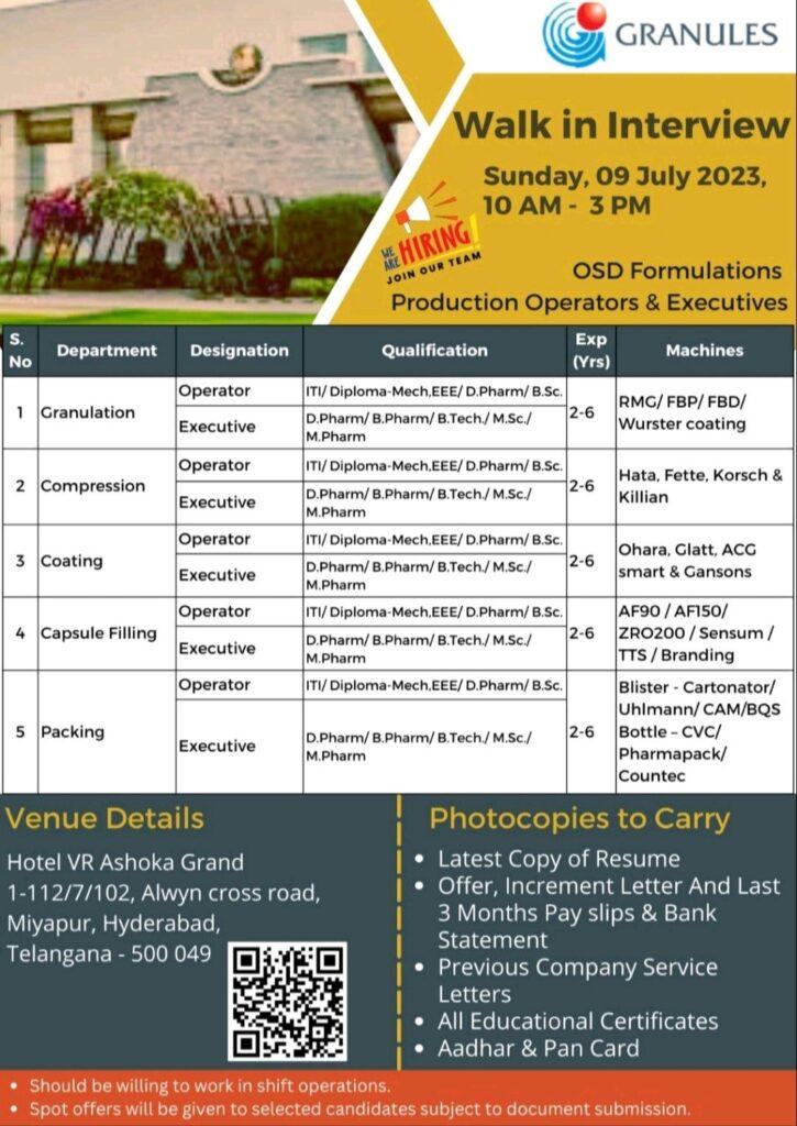 Granules India Ltd Walk In Interview for Granulation, Compression, Coating, Capsule Filling, Packing on Sunday, 09 July 2023