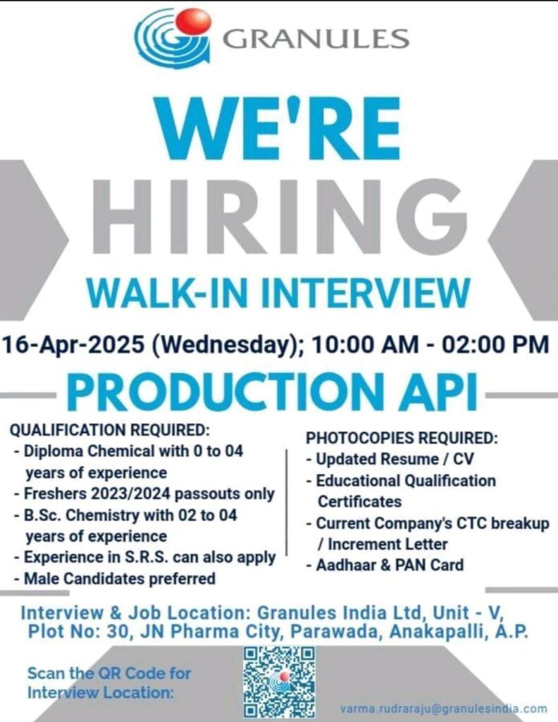 Interview & Job Location: Granules India Ltd, Unit – V, Plot No: 30, JN Pharma City, Parawada, Anakapalli, A.P.