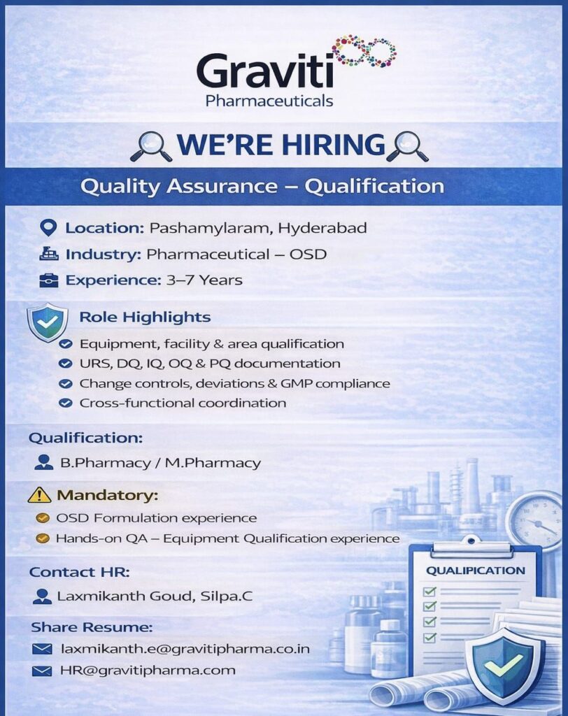 Graviti Pharmaceuticals is currently seeking skilled professionals to join their team in the field of Quality Assurance – Qualification. This recruitment drive targets experienced individuals in the Pharmaceutical – OSD (Oral Solid Dosage) industry.