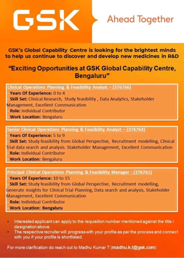 GSK multiple opportunities at Clinical Operations Planning & feasibility team at GSK Global Capability Centre, Bengaluru