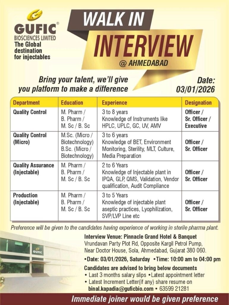 Gufic Biosciences Limited, a leading global destination for injectables, is hosting a walk-in interview drive in Ahmedabad on January 3rd, 2026. This is a prime opportunity for pharmaceutical professionals looking to advance their careers in a sterile manufacturing environment. The company is specifically seeking candidates for roles in Quality Control, Quality Assurance, and Production.