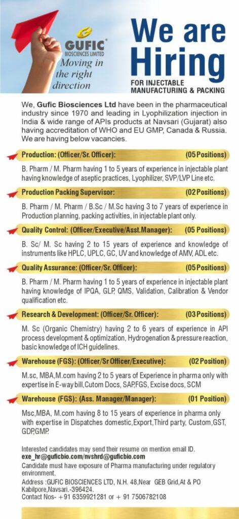 We, Gufic Biosciences Ltd have been in the pharmaceutical industry since 1970 and leading in Lyophilization injection in India & wide range of APIs products at Navsari (Gujarat) also having accreditation of WHO and EU GMP, Canada & Russia. We are having below vacancies.