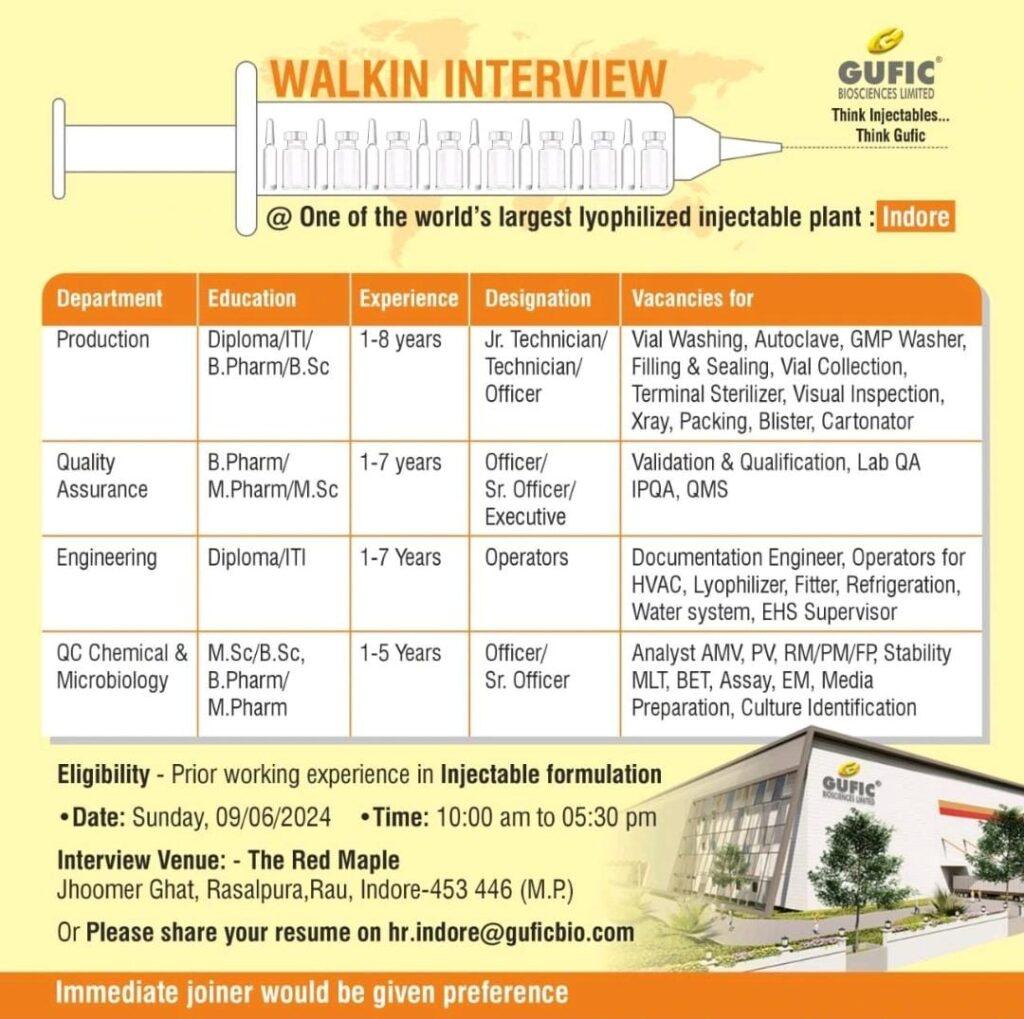 Gufic Biosciences walk in interview for Production, QA, Engineering, QC & Microbiology on Sunday, 09/06/2024
