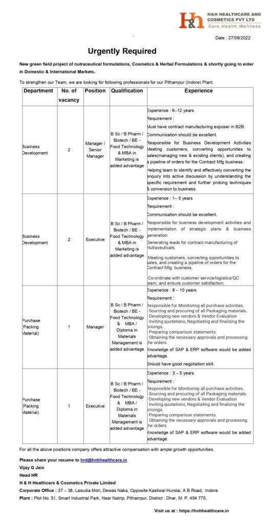 H & H Healthcare & Cosmetics Private Limited hiring for multiple opening in Business Development & Purchase (Packing Material) department for Pithampur (Indore) Plant