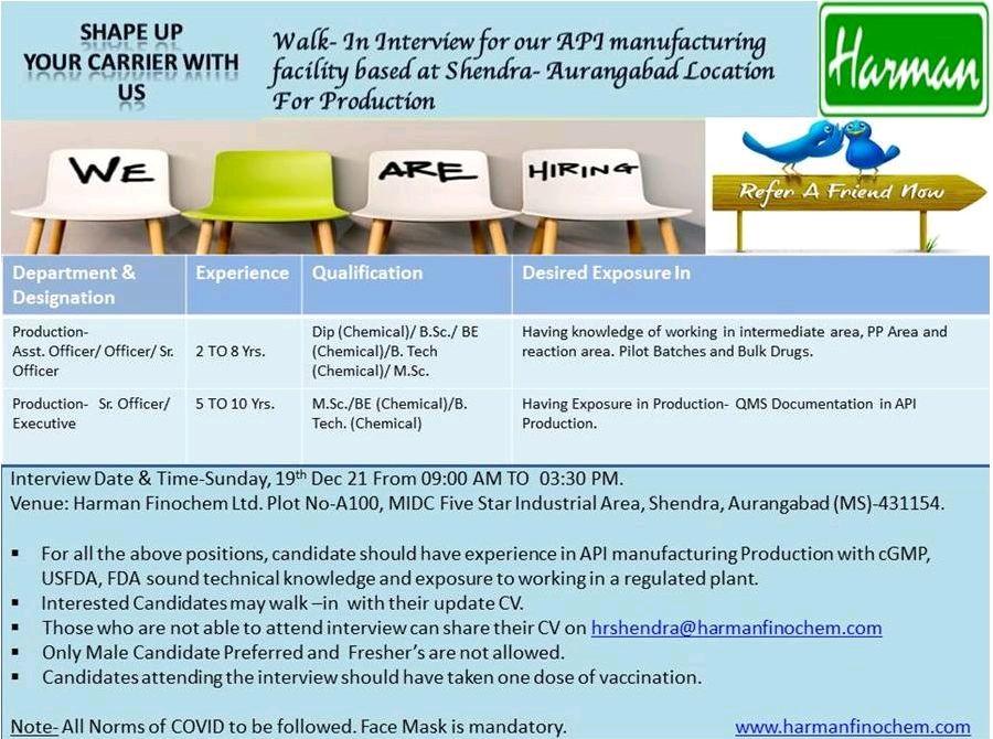 Harman Finochem Ltd. Walk In Interview for Production Department on 19th Dec’ 21