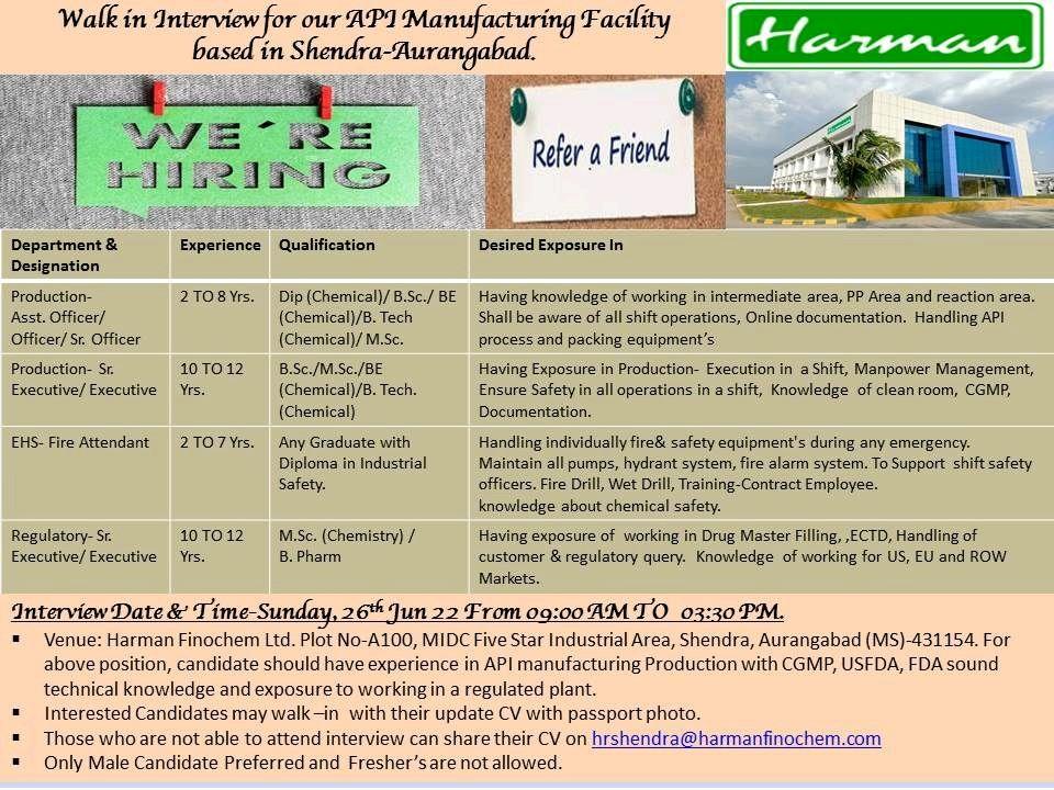 Harman Finochem Walk In Interview for Production, EHS & Regulatory department on Sunday, 26th Jun 22