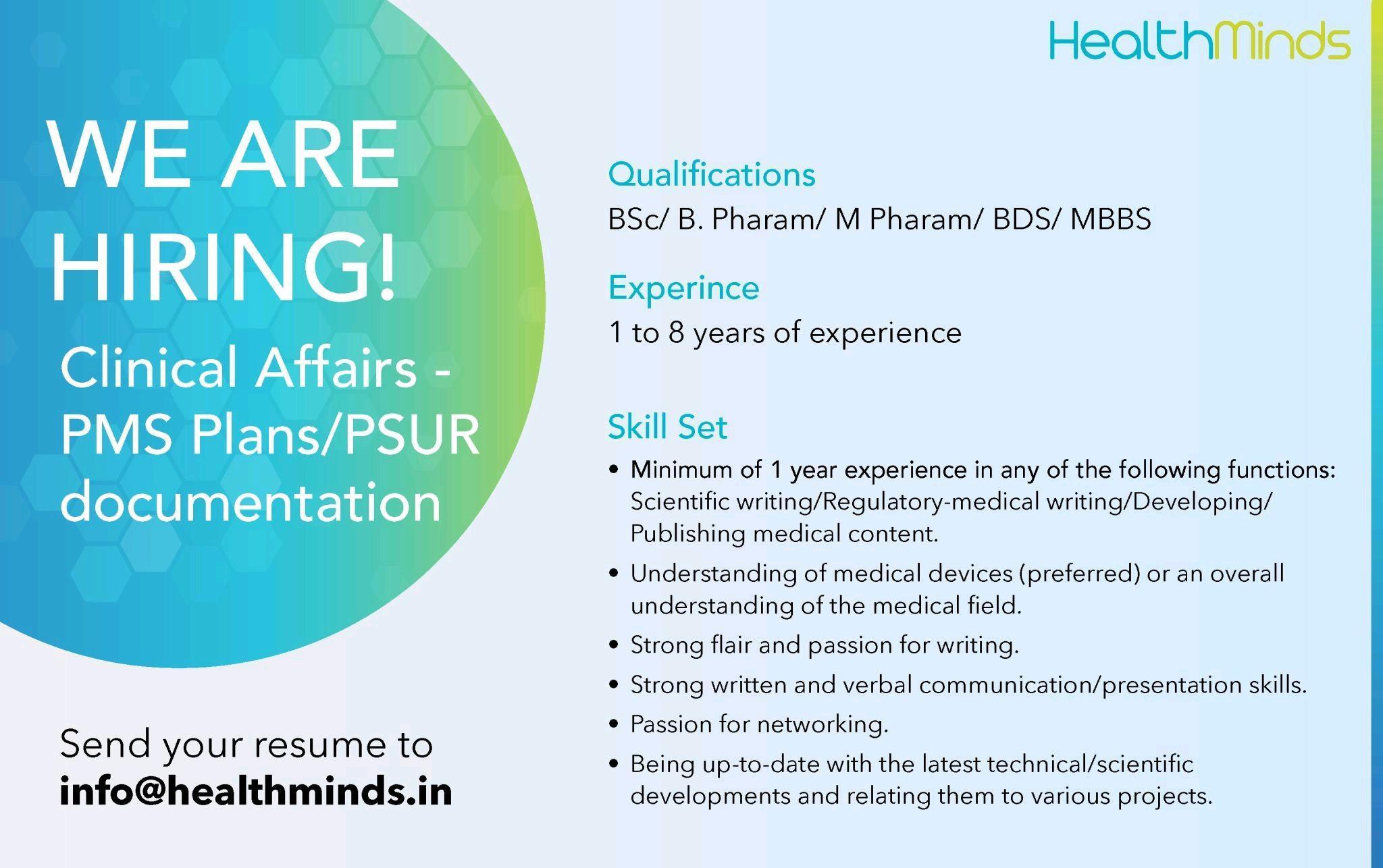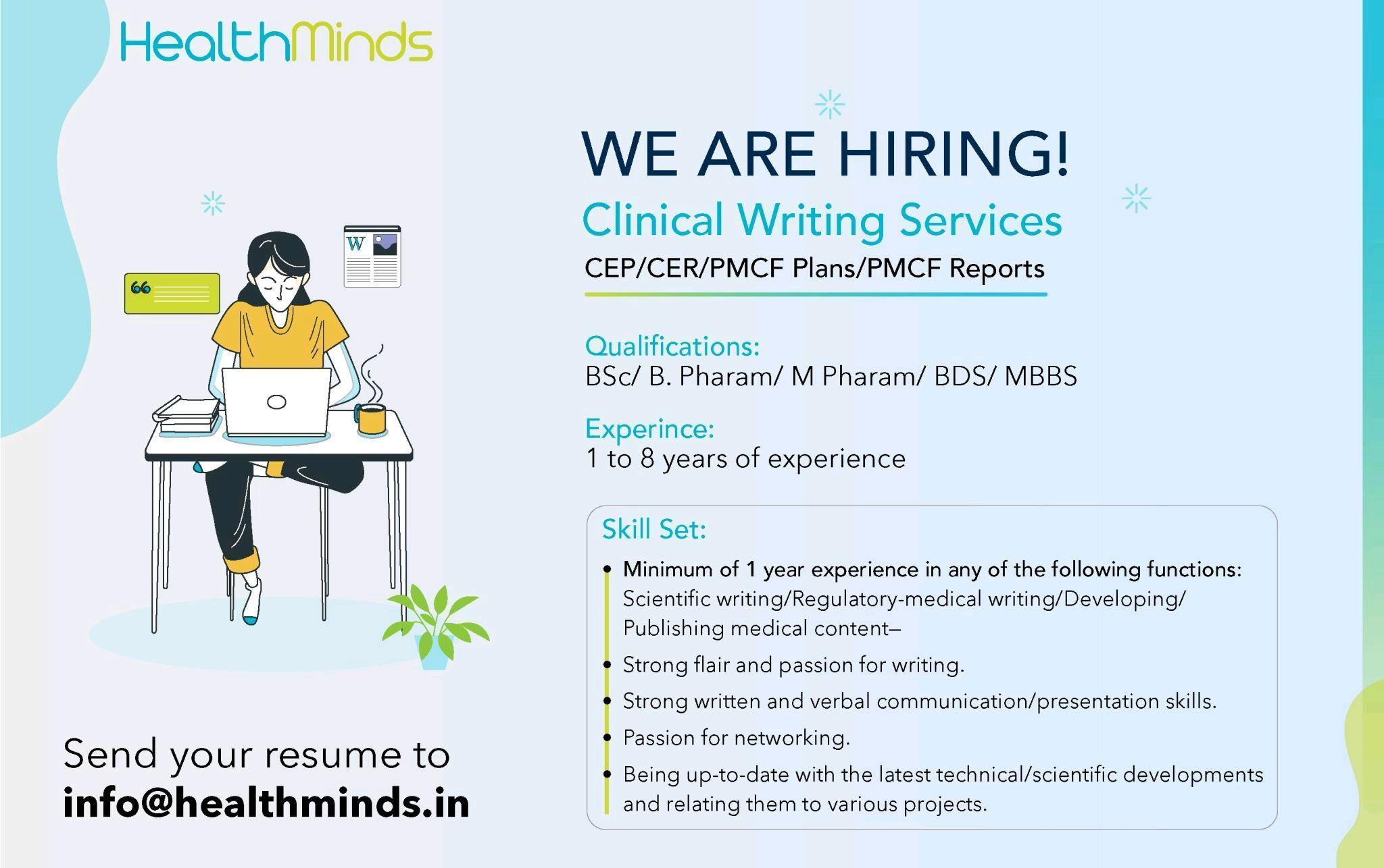 HealthMinds hiring for Regulatory Associate, Clinical Writing Services & Clinical Affairs- PMS Plans / PSUR documentation