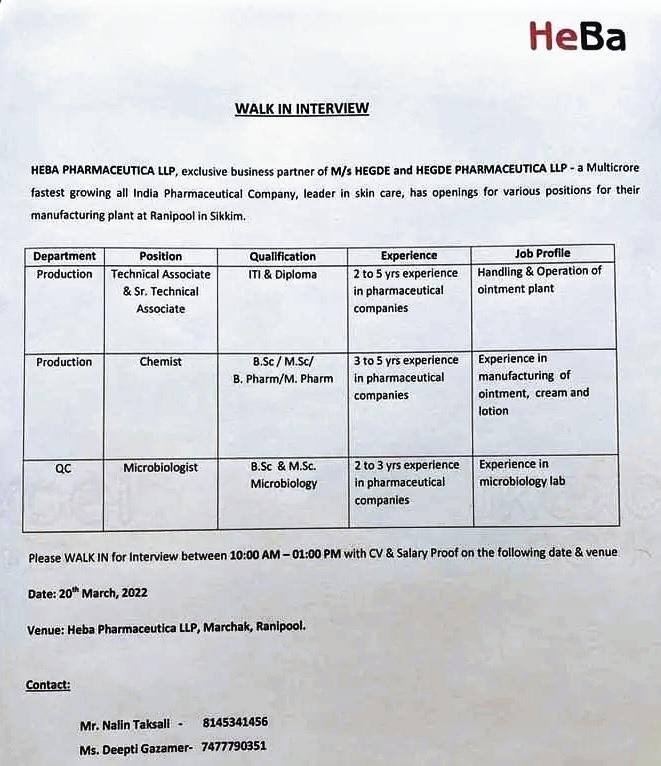 Heba Pharmaceiutica LLP. exclusive business partner of M/s HEGDE and HEGDE PHARMACEUTICA LLP – a Multicore fastest growing all india pharmaceutical company, leader in Skin care, has openings for various positions for their manufacturing plant at Ranipool in Sikkim.
