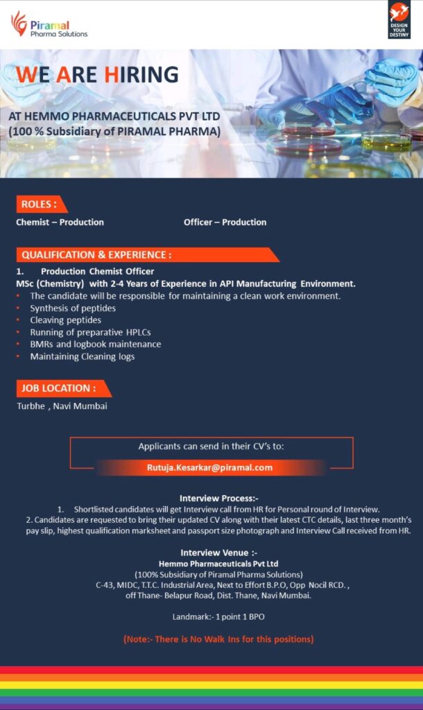 Here’s your chance to join our team of enthusiastic professionals at Hemmo Pharmaceuticals Private Limited, Turbhe (a 100% subsidiary of Piramal Pharma Solutions) and design your next career move.