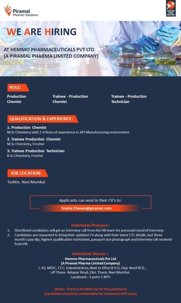 HEMMO PHARMACEUTICALS hiring Freshers & experience for API Production department