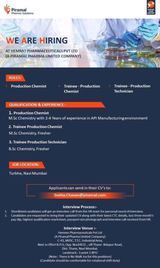 Hemmo Pharmaceuticals Private Limited, Turbhe (A Piramal Pharma Limited Company) hiring FRESHERS for Trainee Production Chemist/ Technician- Apply Now
