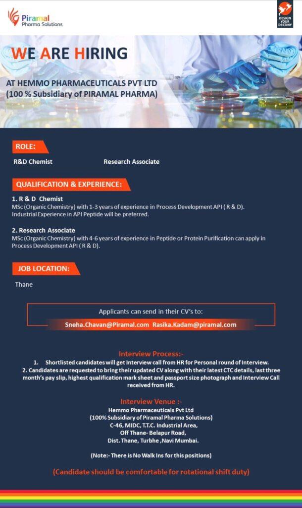 Hemmo Pharmaceuticals (Subsidiary of Piramal Pharma) hiring for R&D Chemist, Research Associate -Apply Now