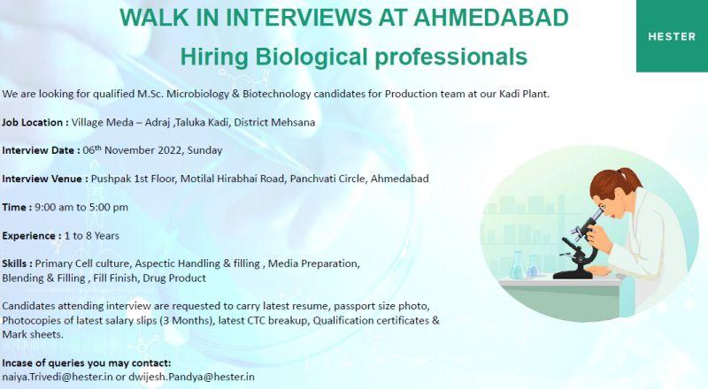 WALK IN INTERVIEWS AT AHMEDABAD Hiring Biological professionals