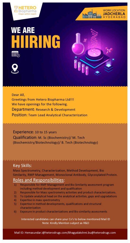Hetero Biopharma Ltd hiring for Team Lead Analytical Characterization- Research & Development department