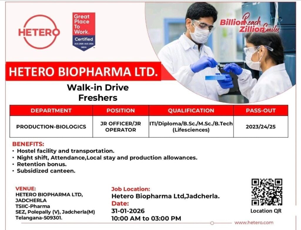 Hetero Biopharma Ltd., a leader in the pharmaceutical industry and certified as a “Great Place to Work,” has announced an exciting walk-in recruitment drive exclusively for freshers. This is a golden opportunity for recent graduates and diploma holders to kickstart their careers in the specialized field of Biologics.