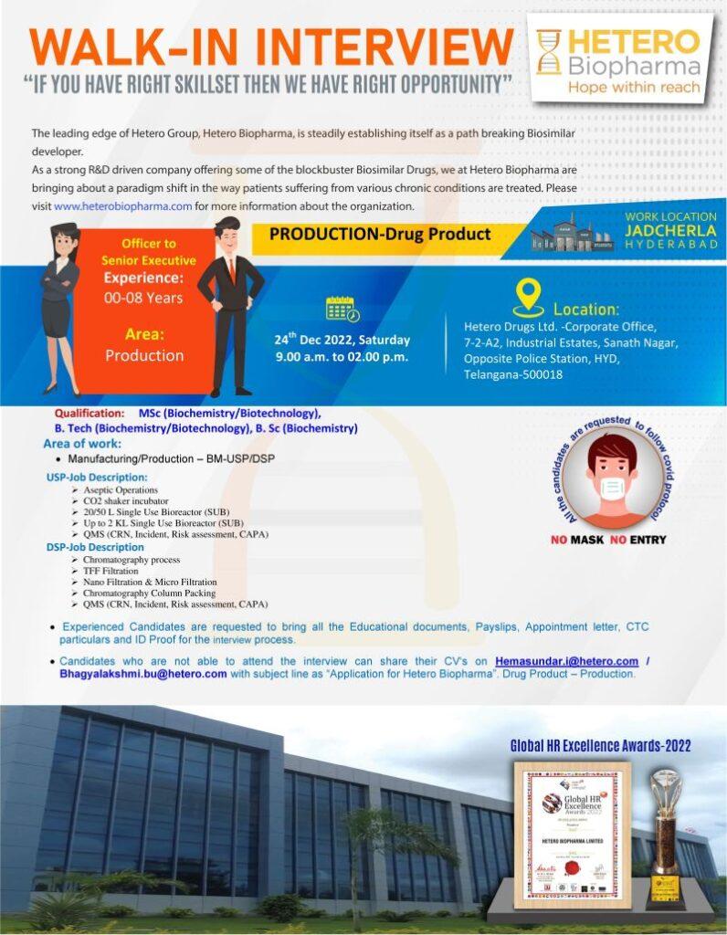 Hetero Biopharma- Walk In Interview for Fresher’s & experience in PRODUCTION- Drug Product on 24th Dec 2022