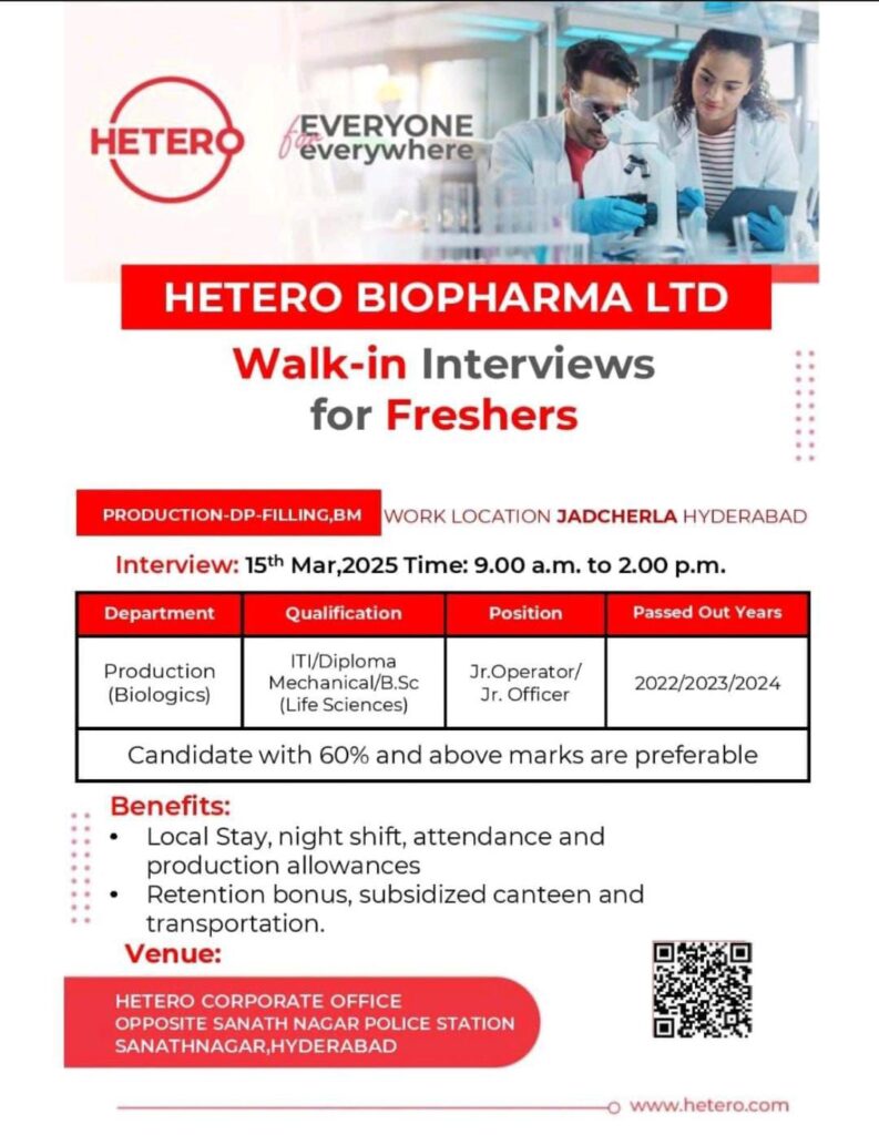 HETERO BIOPHARMA LTDWalk-in Interviews for Freshers