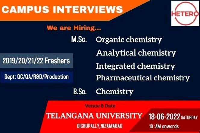 HETERO Campus Interview for Freshers M.Sc, B.Sc in QC/ QA/ R&D/ Production on 18-06-2022