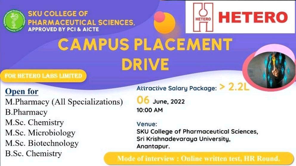 Hetero Conducting Campus placement for Freshers Bsc Chemistry ,MSc Chemistry, Bpharmacy, Mpharmacy, BTech Chemical on 06 June, 2022