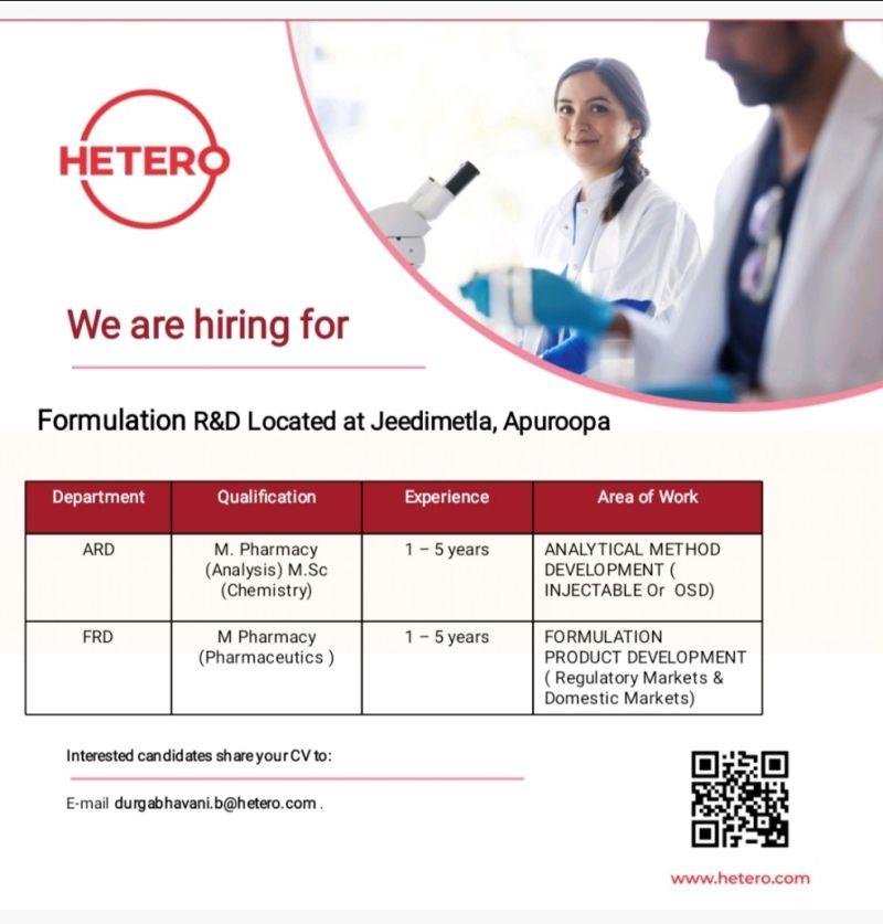 Hetero hiring for Formulation R&D- ARD, FRD OSD, Injectable, Hormones – Apply Now