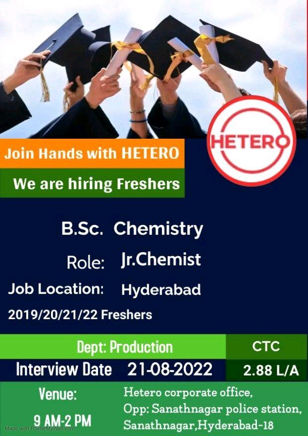 HETERO hiring Freshers for Jr.Chemist Production department on 21st Aug 2022