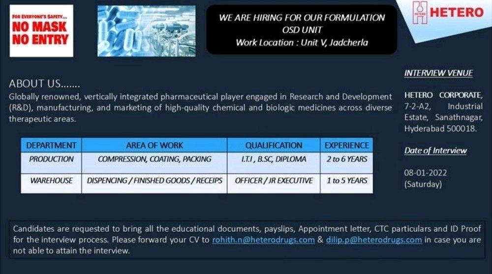 Interested candidates can attend interview on 8th Jan 2022, in Hetero corporate office,