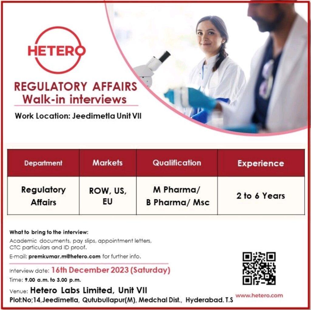 Hetero Labs Limited, Unit VII Walk-in interviews for Regulatory Affairs department on 16th December 2023