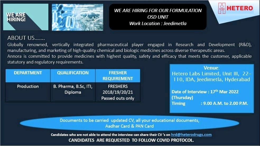 Candidates who are not able to attend the interview can share their CV’s on hrd@heterodrugs.com