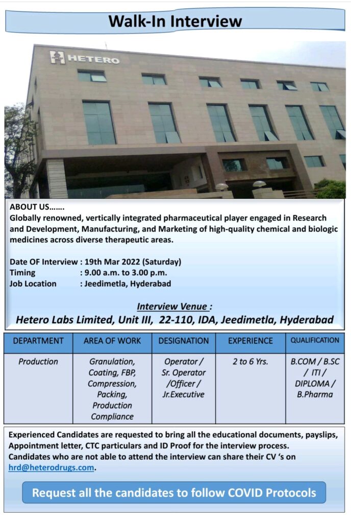 Candidates who are not able to attend the interview can share their CV’s on hrd@heterodrugs.com.