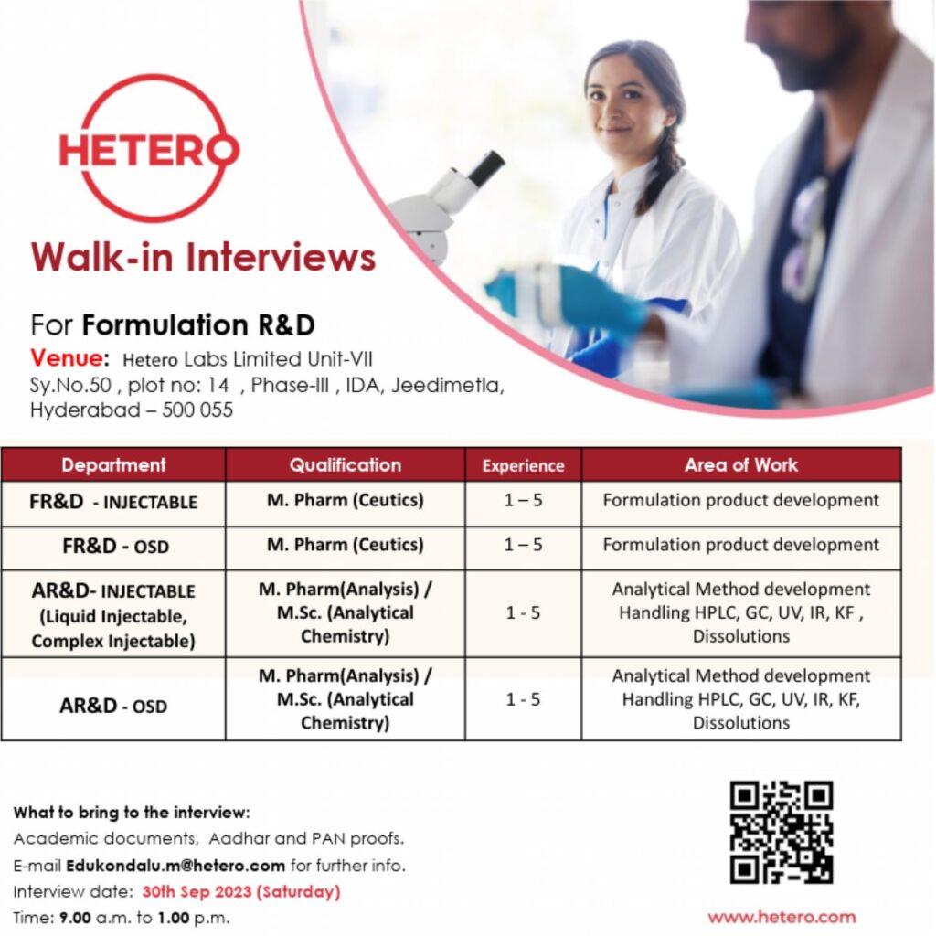 Hetero Labs Limited Walk-in Interviews for multiple opening in FR&D, AR&D department on 30th Sep 2023