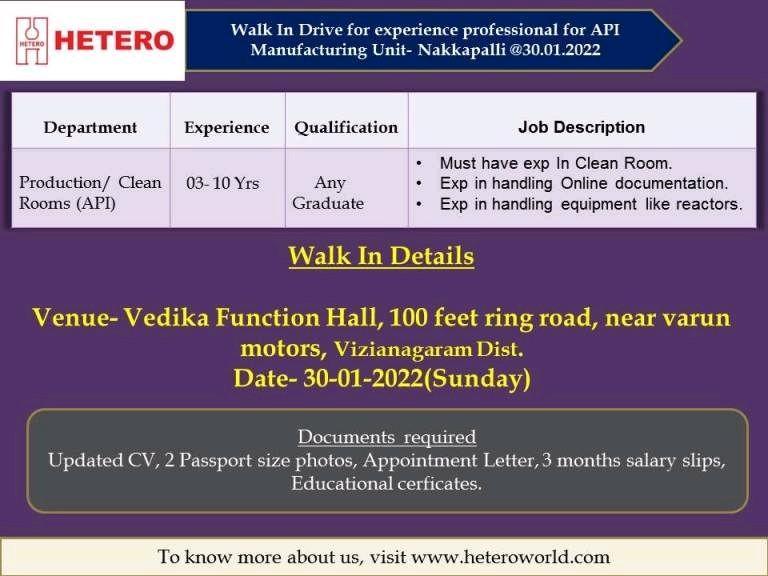 Hetero Labs Limited, Walk-In Interviews for Production & Clean Rooms in API on 30th Jan’ 2022