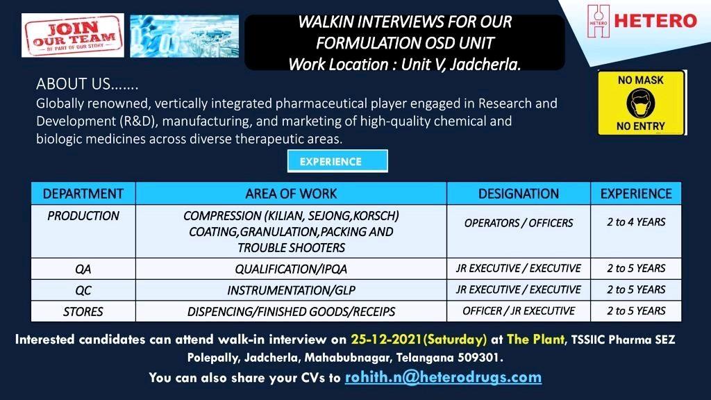 Please forward your CV to rohith.n@heterodrugs.com, in case you are not able to attain the interview.