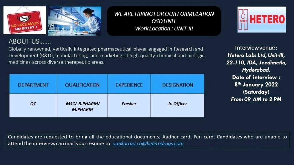 Hetero Labs, Walk In Interview for Freshers M.Sc/ B.Pharm/ M.Pharm on 8th January 2022