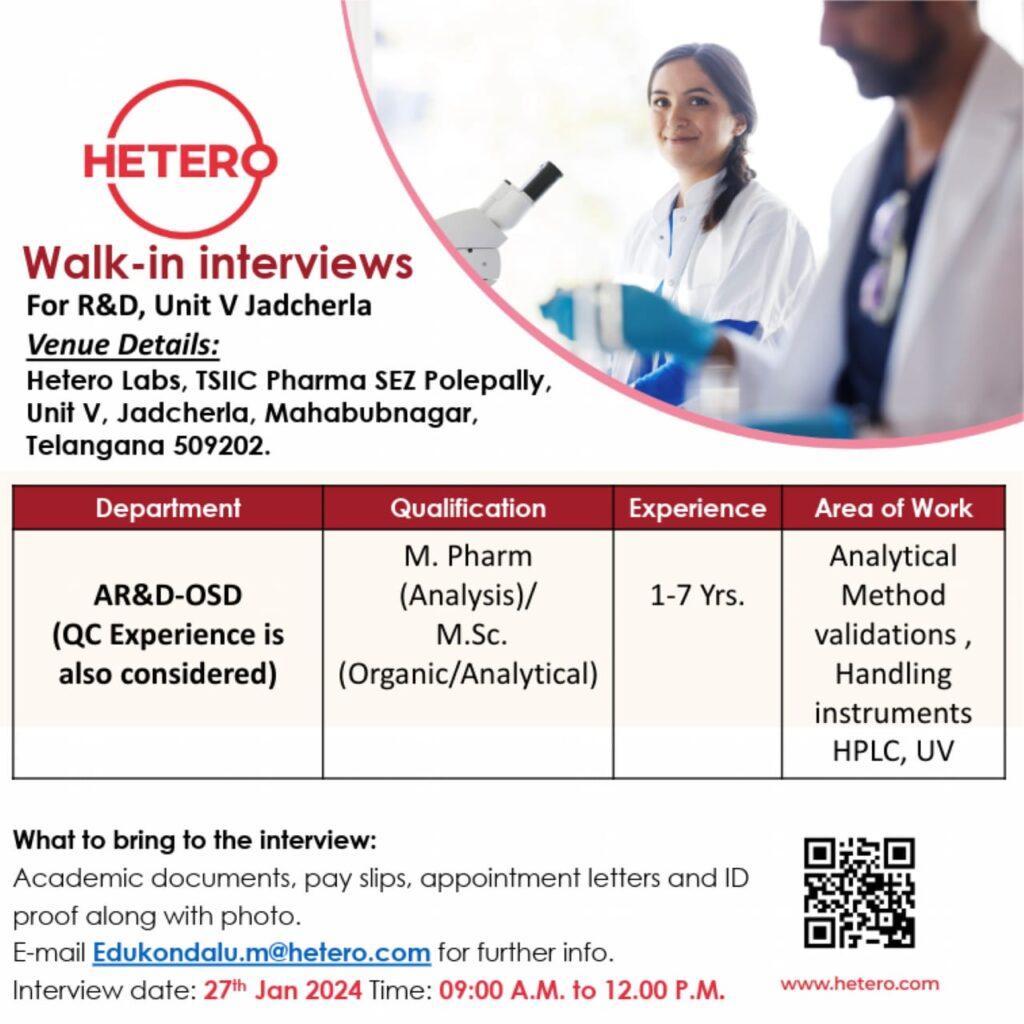 Hetero Labs Walk-in interviews for AR&D- OSD, Unit V Jadcherla on 27th Jan 2024
