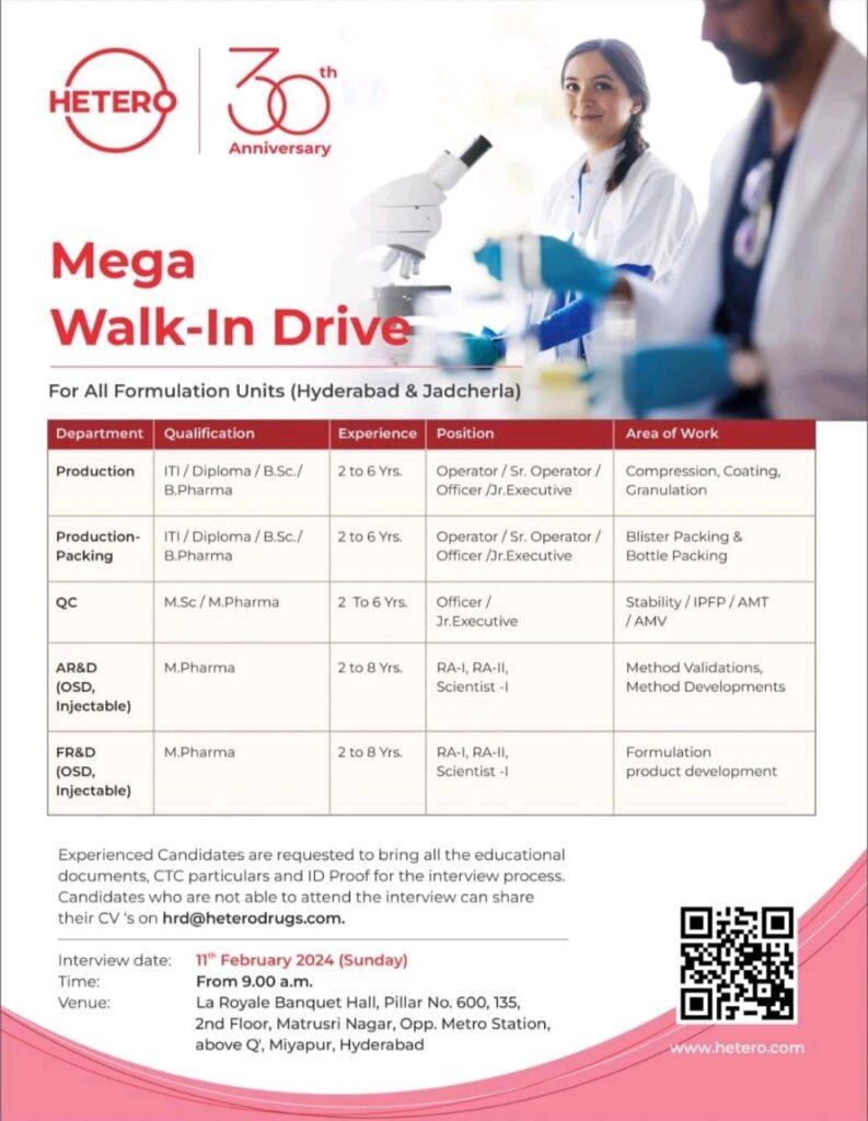 Experienced Candidates are requested to bring all the educational documents. CTC particulars and ID Proof for the interview process Candidates who are not able to attend the interview can share their CV’s on hrd@heterodrugs.com.